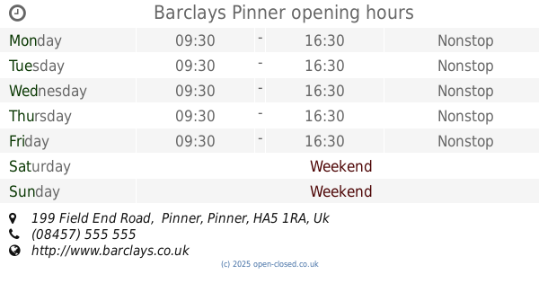 It is also possible to : Edit these OPENING HOURS of Branch Barclays In Pinner, 199 Field End Road, Pinner,